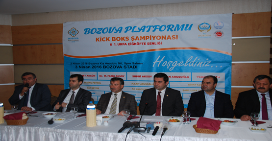 1. Urfa Çiğköfte Şenliği ve Kick-Boks Şampiyonası tanıtım toplantısına Şanlıurfa Ak Parti Milletvekili Halil İbrahim Yıldız, Bozova Kaymakamı Hidayet Sarı, Türkiye Kick Boks Federasyonu Başkanı Salim Kayıcı ve Şanlıurfa Büyükşehir Belediye Başkanı Nihat Çiftçi katıldı.