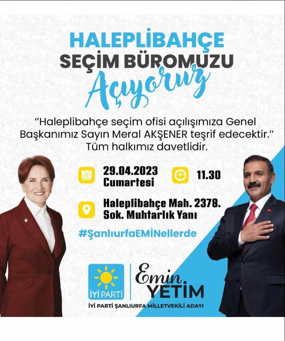 Konu ile ilgili bir açıklama yapan İYİ Parti Şanlıurfa Milletvekili Adayı Emin Yetim, İYİ Parti Genel Başkanı Sayın Meral Akşener hanımefendi 29 Nisan Cumartesi günü havaalanında karşılamadan sonra şehir turu, esnaf ziyareti ve son olarak ise Haleplibahçe Mahallesinde bulunan seçim irtibat büromuzun açılışını yapmak üzere Şanlıurfalı hemşerilerimiz ile bir araya gelecektir.