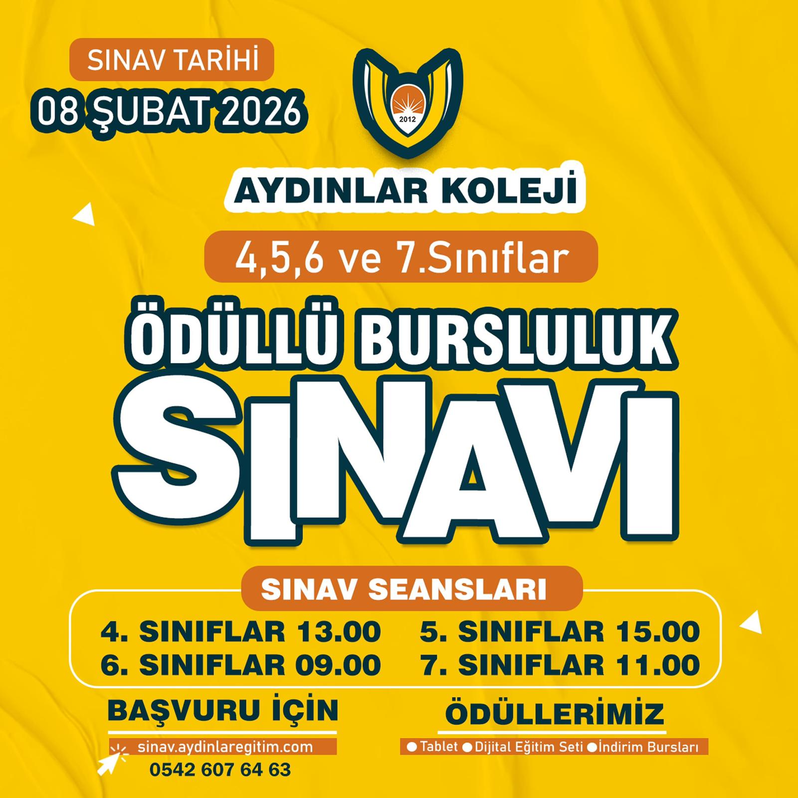 Okula kabul ve bursluluk sınavı, 2026-2027 eğitim öğretim yılı için gerçekleştirilecek ve 4, 5, 6 ve 7. sınıf öğrencilerinin katılımına açık olacak. Sınavın tamamen ücretsiz olduğunu belirten Aydınlar Koleji yetkilileri, öğrencilerin akademik bilgi ve yeteneklerini ölçmenin yanı sıra çeşitli ödüller kazanma fırsatı bulacağını ifade etti.
