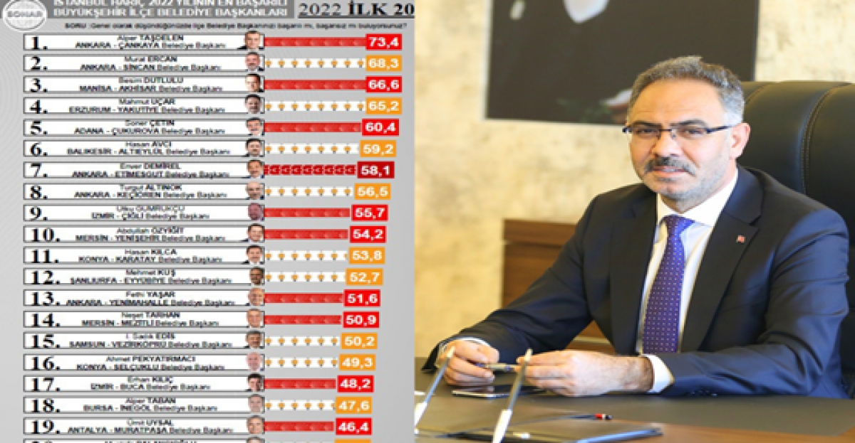 Sonar Araştırma Şirketi’nin Aralık ayında yaptığı 2022 yılının son araştırmasında, İstanbul Hariç 2022 Yılının En Başarılı Büyükşehir İlçe Belediye Başkanları listesinin ilk 20 ismi arasında Ankara Çankaya Belediye Başkanı Alper Taşdelen ilk sırada yer alırken, Eyyübiye Belediye Başkanı Mehmet Kuş 12’nci, Kayseri Melikgazi Belediye Başkanı Mustafa Palancıoğlu ise 20’nci sırada yer aldı.