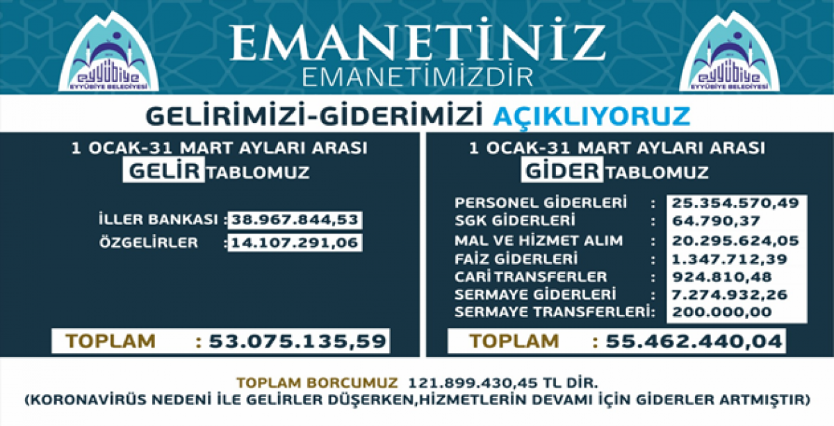 Eyyübiye Belediye Başkanı Mehmet Kuş tarafından açıklanan belediyenin 1 Ocak- 31 Mart 2021 tarihleri arasındaki gelirleri; İller Bankası Geliri:38.967.844,53, Öz gelirler, 14.107.291,06, toplamda; 53.075.135,59 şeklinde açıklanırken, Giderler ise, Personel giderleri; 25.354.570,49, SGK Giderleri, 64.790,37, Mal ve Hizmet Giderleri, 20.295.624,05, Faiz giderleri, 1.347.712,39, Cari Transferler, 924.810,48, Sermaye Giderleri, 7.274.932,26, Sermaye Transferleri, 200.000,00 toplamda ise, 55.462.440,04 olarak açıklandı.