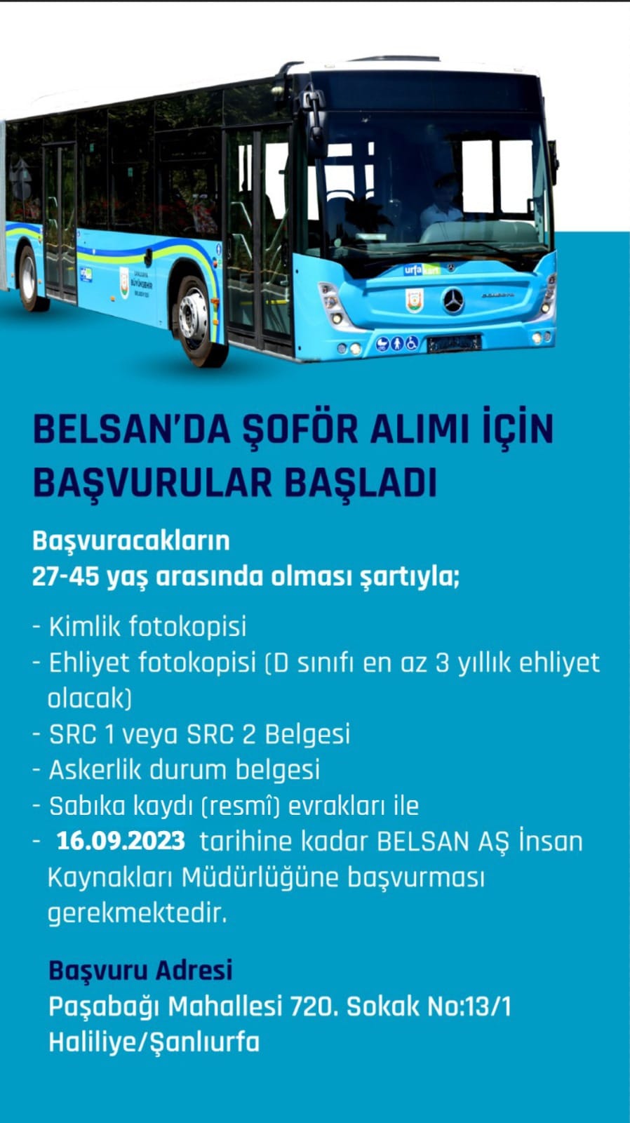 BELSAN AŞ’den yapılan açıklamada Şanlıurfa Büyükşehir Belediyesi bünyesindeki şehir içi toplu taşıma hatlarında şoför olarak değerlendirilmek üzere 45 yaşından gün almamış adayların başvurularının alınmaya başlandığını açıkladı.