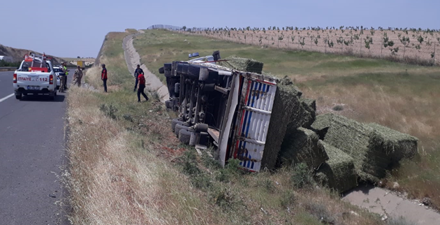 Birecik'te saman yüklü tır devrildi