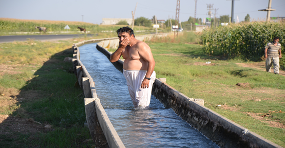 Hava sıcaklığının 38 derece olduğu kentte nem ile birlikte sıcaklığın artması hayatı olumsuz yönde etkiliyor. Sıcaklığın nem ile birleştiğinde hissedilen sıcaklığın 45 dereceye ulaştığı Şanlıurfa’da vatandaşlar nefes almakta güçlük çekiyor. Kentte yük taşıyan Suriyeli vatandaşlar sıcaktan ve terlerini atmak üzere Kısas yolunda bulunan DSİ ait sulamam kanaletinde kendilerince serinleme yöntemleri geliştiriyor. Suriyeli yük taşıyıcıları üzerindeki teri atmak ve serinlemek için kanaletlerde pijama ile serinlemeye çalışması yol kenarında geçen vatandaşların dikkatinden kaçmadı.