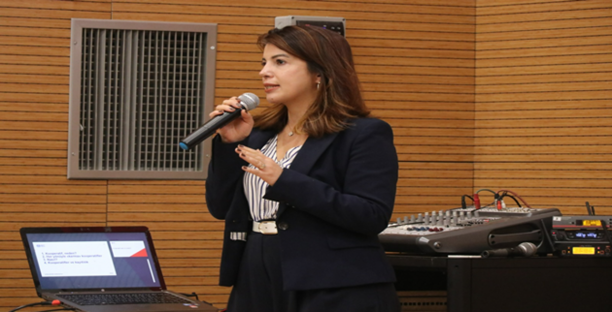 Panelde konuşan Geçim Kaynakları Uzmanı Ayşe Turunç Kankal, Kooperatifler ve İLO konusunda katılımcılara bilgiler verdi.