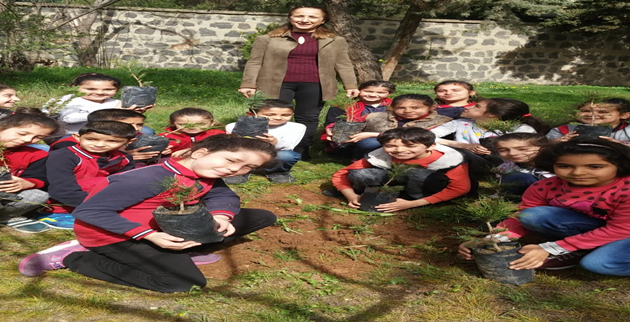 Şanlıurfa'nın Haliliye ilçesinde 21-26 Mart Dünya Ormancılık Günü ve Orman Haftası münasebetiyle Cengiz Topel İlkokulu bahçesine öğrenciler, fidan dikti.