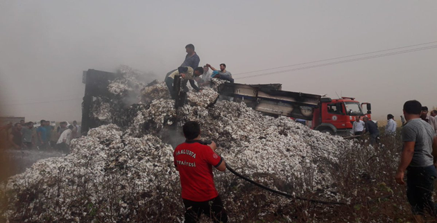 Şanlıurfa'nın Ceylanpınar İlçesi'nde, pamuk yüklü kamyonun elektrik tellerine temas etmesi nedeniyle çıktığı ileri sürülen yangında tonlarca pamuk kullanılamaz hale geldi.