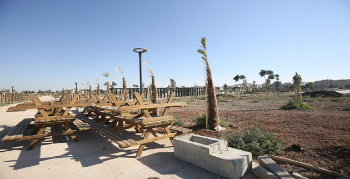 Binlerce yetişkin ağaç ve bitkinin dikildiği Eyyübiye Millet Bahçesi’nde bir yandan yapılan yeşillendirme çalışmasının kök salması için yoğun çaba harcanırken, diğer yandan yapısal peyzaj ve sosyal donatı alanlarındaki inşaat çalışmaları hızla devam ediyor.
