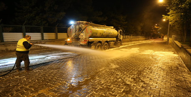 Eyyübiye Belediyesi Temizlik İşleri Müdürlüğüne bağlı ekipler, Başkan Mehmet Kuş’un talimatlarıyla Koronavirüs salgınıyla mücadele tedbirleri kapsamında çalışmalarını gece gündüz ayırt etmeksizin sürdürüyor.