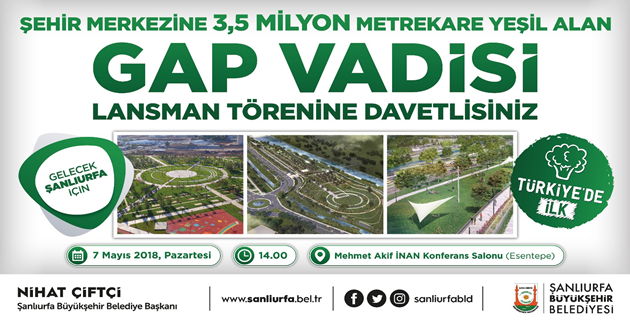 Şanlıurfa Büyükşehir Belediyesinin kent ormanı ile birleştirmeyi planladığı ve 6 etaptan oluşan GAP Vadisi Projesi kamuoyuna tanıtılıyor. Şanlıurfa tarihinin en büyük yeşil alan projesi olacak GAP Vadisi 3 milyon 500 bin metrekareyi kapsayacak.