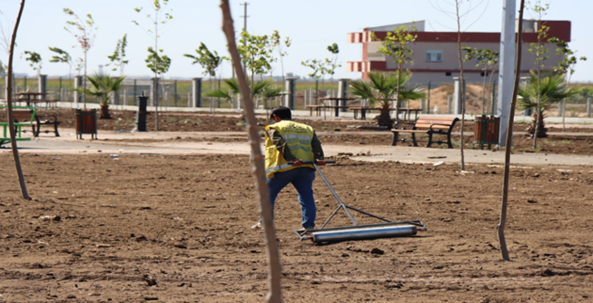 Şanlıurfa Büyükşehir Belediyesi’nin tarihi Harran ilçesinde ağaçlandırma ve çevre düzenleme çalışmasını tamamladığı Harran Kent Parkı’nda çimlendirme çalışması başlatıldı.