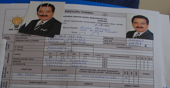 Şanlıurfalı ünlü sanatçı imparator İbrahim Tatlıses'in avukatı 1 Kasımda gerçekleşecek olan erken seçimde Tatlıses'in Milletvekilliği aday adayı müracaatını yaptı Tatlıses 63. başvuran kişi oldu.