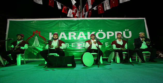 Karaköprü Amfi Tiyatro alanında düzenlenen programda Dergâh Camii İmam Hatibi İbrahim Onat tarafından Kur’an’ı Kerim tilaveti yapıldı. Vatandaşlara Kur’an ziyafeti verilen gecede ilahi dinletisi ve sema gösterisi de düzenlendi.