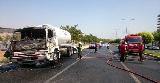 Şanlıurfa'da, park halindeyken elektrik kontağı yüzünden ön bölümü alev alan LPG tankeri itfaiye ekiplerince söndürüldü.