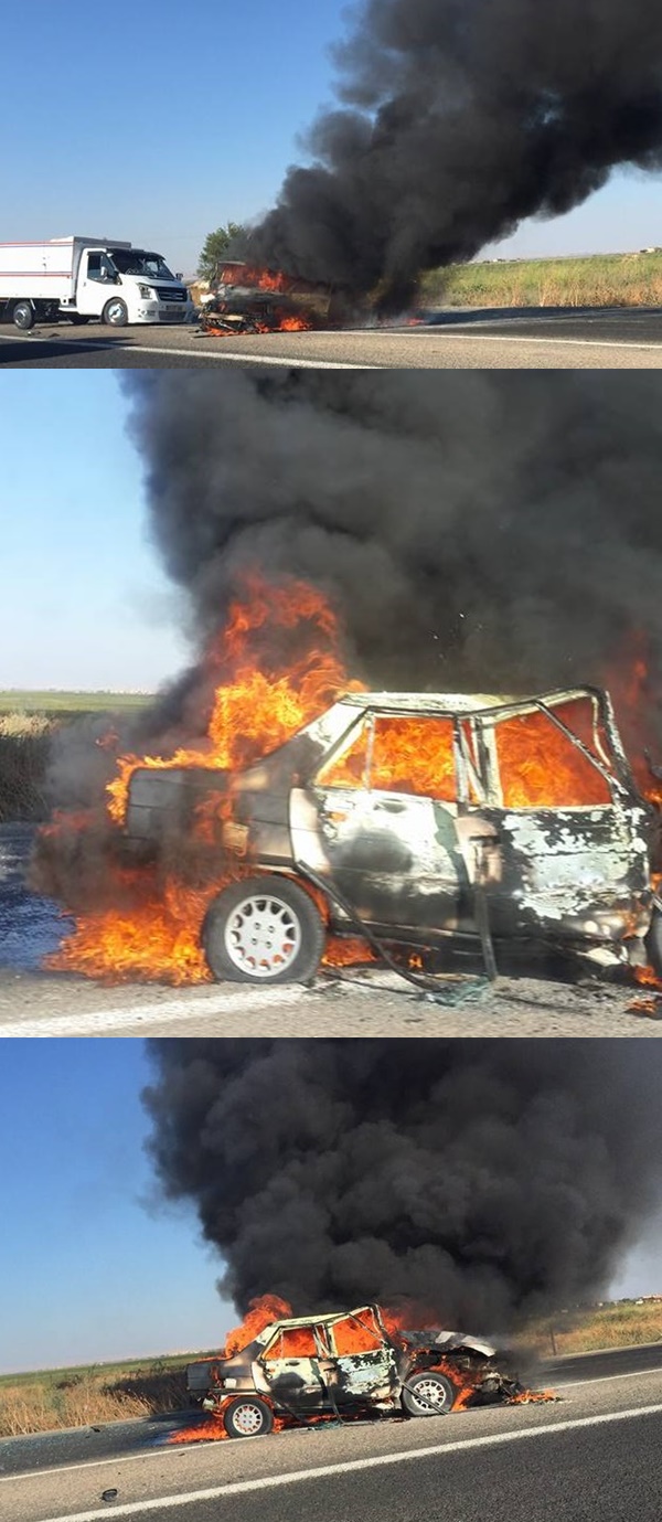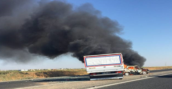 Şanlıurfa- Akçakale karayolunda iki otomobil çarpıştı. Çarpışma sonrası bir araç alev aldı.