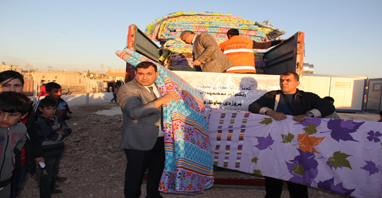 Kuzey Irak İslami Birlik Partisi’ne üye Dohoklu Parlamenterlerin Suruç’ta kalan Kobanili misafirlere gönderdikleri insani yardım malzemeleri, Büyükşehir Belediyesi koordinatörlüğünde dağıtılıyor.