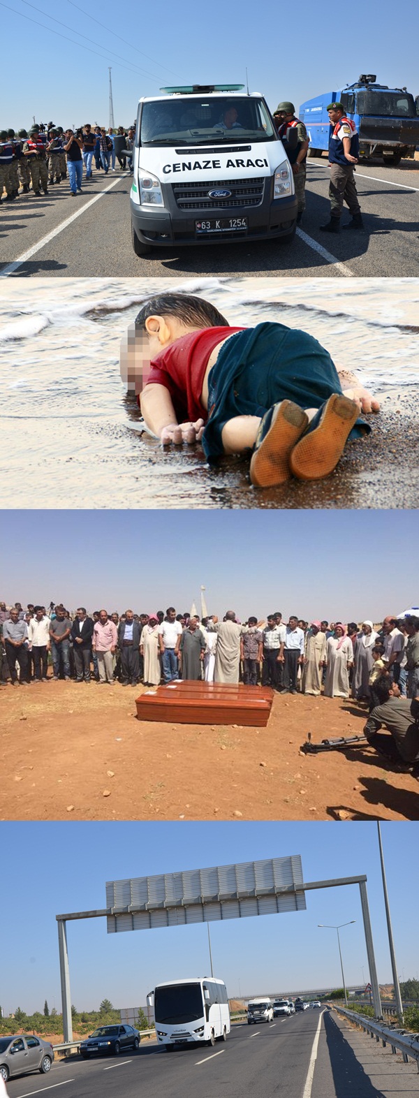 GAP Havaalanına gelen minik Aylan Annesi ve Abisi Galip Kurdi 'nın cenazeleri buradan Şanlıurfa Büyükşehir Belediyesine ait cenaze aracıyla geniş güvenlik önlemleri altında Şanlıurfa’nın Suruç ilçesinden Kobani’ye götürüldü. Kobani Mürşitpınar sınır kapısına 1 kilometre kala güvenlik önlemleri alan jandarma ekipleri AK Parti Milletvekilleri Mezhar Bağlı ve Hasan Okten HDP Millettekileri Dilek Öcalan Leyla Güven CHP Milletvekeli Sezgin Tanrıkulu ,yu Jandarma Milletvekillerini sınır kapısına bırakırken. Basını ise kapıya yaklaştırmadı Ölümünün ardından dünya gündemine oturan Aylan Kurdi Kobani’de kendi köyünde defnedilecek. Sınırda kısa bir konuşma yapan AK Parti Muğla milletvekili Hasan okten cenazeleri önce Delaman hava alanına getirdik buradan İstanbul.a İstanbuldan.Şanlıurfa,ya gadirdik burada başta valimiz olmak üzere herkes seferber oldu en azından acılı babanın acısını azatmak için tüm imkanlarımızı kulandık çok üzücü bir hadisedir diye konuştu .Şanlıurfa Ak Parti Milletvekili Mezhar Bağlı yüreklerimiz dağlandı babayla birlikte yolculuk yaptık babayı çok metanetli gördüm Allah böyle kimseye acı yaşatmasın ben hayatımın en yolculuğunu yaptım sayın başbakanımızın talimatı ile Aileye gereken tüm yardımın yapılmasını söyledi bizde tüm imkanlarımızı kulandık .diye konuştu Güvenlik görevleri Gap Hava alanına Basını almazken geniş güvenlik önlemleri aldı