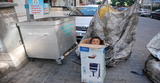 Şanlıurfa kent genelinde birçok çocuk, sabah erken saatlerinden itibaren harçlıklarını çıkarabilmek ve ailelerine yardım etmek için çöplerde plastik ve karton topluyor. Bazen öyle yorgunluk oluyor ki çalışırken uyuya kalıyor.