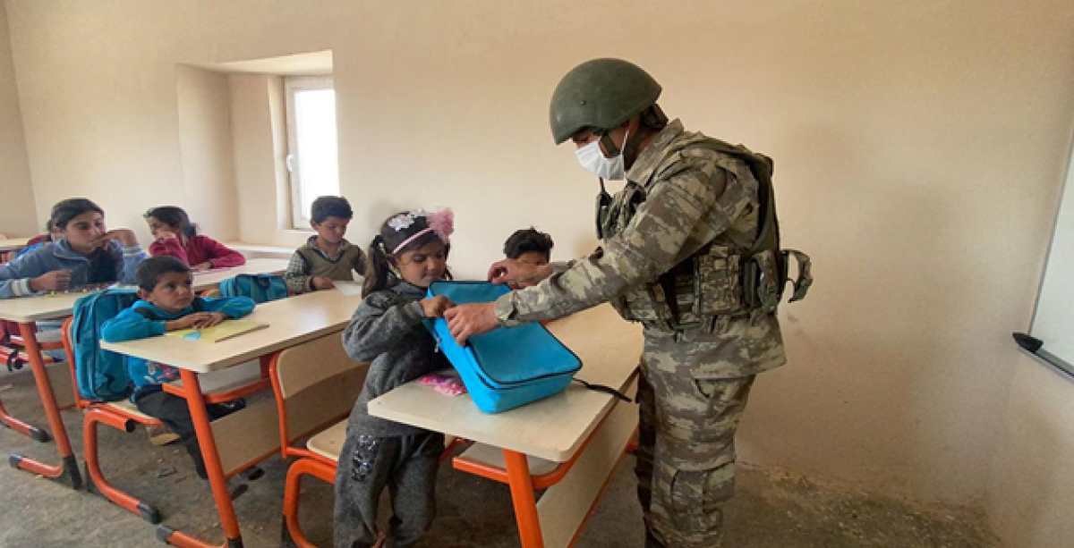 Mehmetçik, Barış Pınarı Harekatı'nın düzenlendiği bölgedeki sivillere insani yardımlarla destek olmaya devam ediyor. Mehmetçik, bölgedeki bir ilkokulun minik öğrencilere kırtasiye yardımında bulundu.