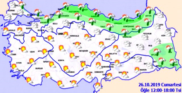 Meteoroloji Genel Müdürlüğü tarafından yapılan son değerlendirmelere göre; ülkemizin kuzey, iç ve doğu kesimlerinin parçalı ve çok bulutlu, Batı ve Orta Karadeniz kıyıları, Doğu Karadeniz, Doğu Anadolu'nun güneydoğusu, Sakarya, Karabük, Amasya, Tokat ve Erzincan çevreleri ile İstanbul ve Kocaeli'nin kuzey, Kırklareli'nin doğu kıyılarının yerel olmak üzere sağanak ve gök gürültülü sağanak yağışlı, diğer yerlerin az bulutlu ve açık geçeceği tahmin ediliyor.