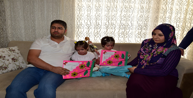 Kelebek hastalığı nedeniyle eğitim öğretimlerine evde devam eden Ayşenur Tuğçe ve Fatma Taş kardeşlerin karnelerini Şanlıurfa Valisi Güngör Azim Tuna verdi.