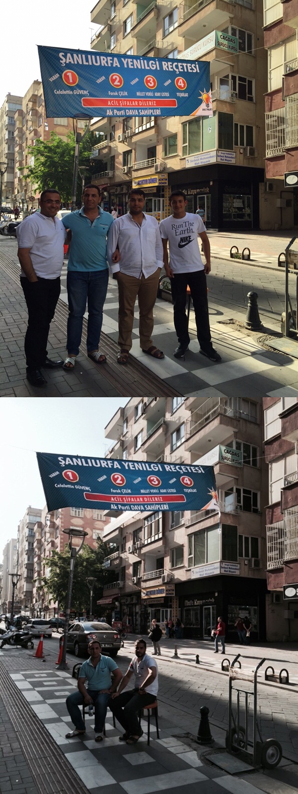 Şanlıurfa'nın Haliliye Bahçelievler Mahallesi 101 sokakta bir grup esnaf, AK Parti’nin oy kaybına uğramasına yol açanları sıraladıkları pankartı cadde üzerinde astılar. Pankartın altına “Ak Parti dava sahipleri” diye not düşen esnaf, Partinin oy kaybı olarak gördükleri Büyükşehir Belediye Başkanı Celalettin Güvenç, Çalışma ve Sosyal Güvenlik Bakanı Faruk Çelik, AK Parti milletvekili adayı listesi ve Ak Parti il teşkilatına bağladı. Pankartı “Şanlıurfa yenilgi reçetesi” olarak isimlendiren esnaf, nedenlerin altına da “Acil şifalar dileriz” notunu düştü.