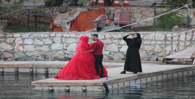 Halfeti'de Gelin ve Damat adaylarının fotoğraf çekimleri yapılırken sahilde bulunan vatandaşların meraklı bağışları üstlerindeydi.