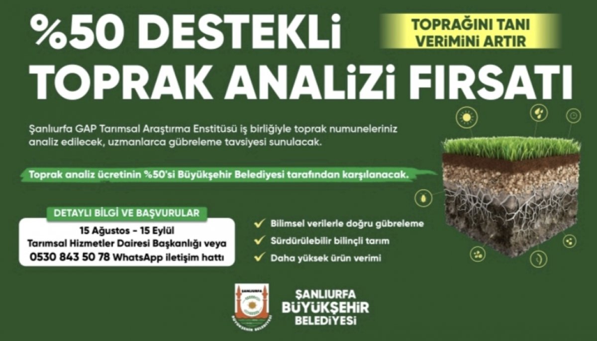 Şanlıurfa Büyükşehir Belediyesi ve GAP Tarımsal Araştırma Enstitüsü işbirliğiyle başlatılan proje kapsamında, toprak analizi yaptırmak isteyen çiftçilere %50 hibe desteği sağlanacak. Toprağın fiziksel ve kimyasal özelliklerini ortaya çıkaran analizler sayesinde, üretimde kalite artışı sağlanırken çevre kirliliğinin önüne geçilmesi hedefleniyor. Bu sayede çiftçiler, ekim yapılacak alanların ihtiyaçlarına göre bilinçli gübreleme ve sulama uygulamaları yapabilecek.