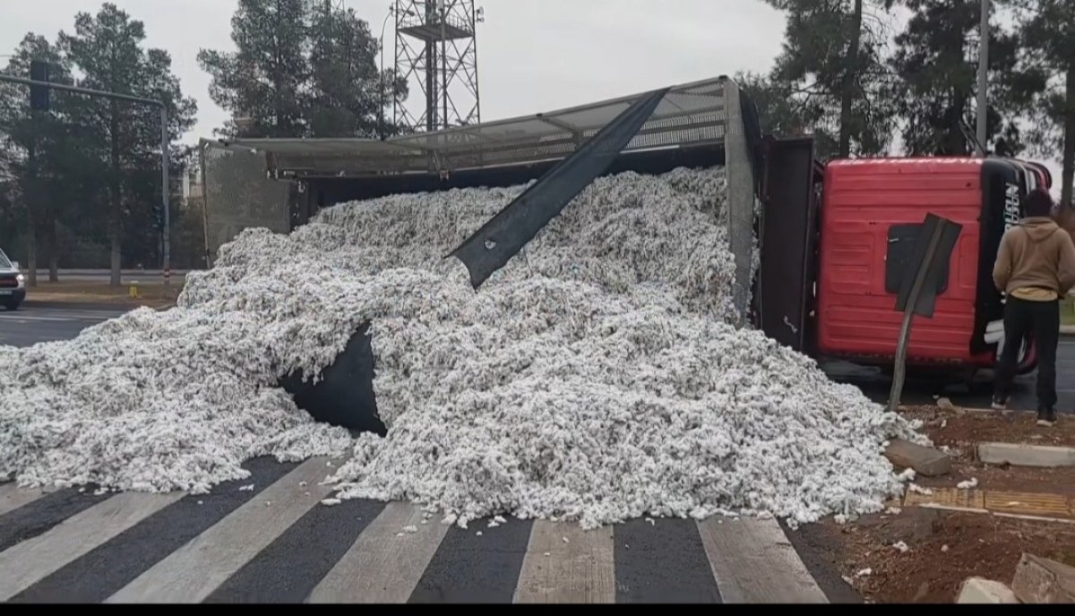 Şanlıurfa’nın Viranşehir ilçesinde sabah saatlerinde pamuk yüklü bir kamyon devrildi.
