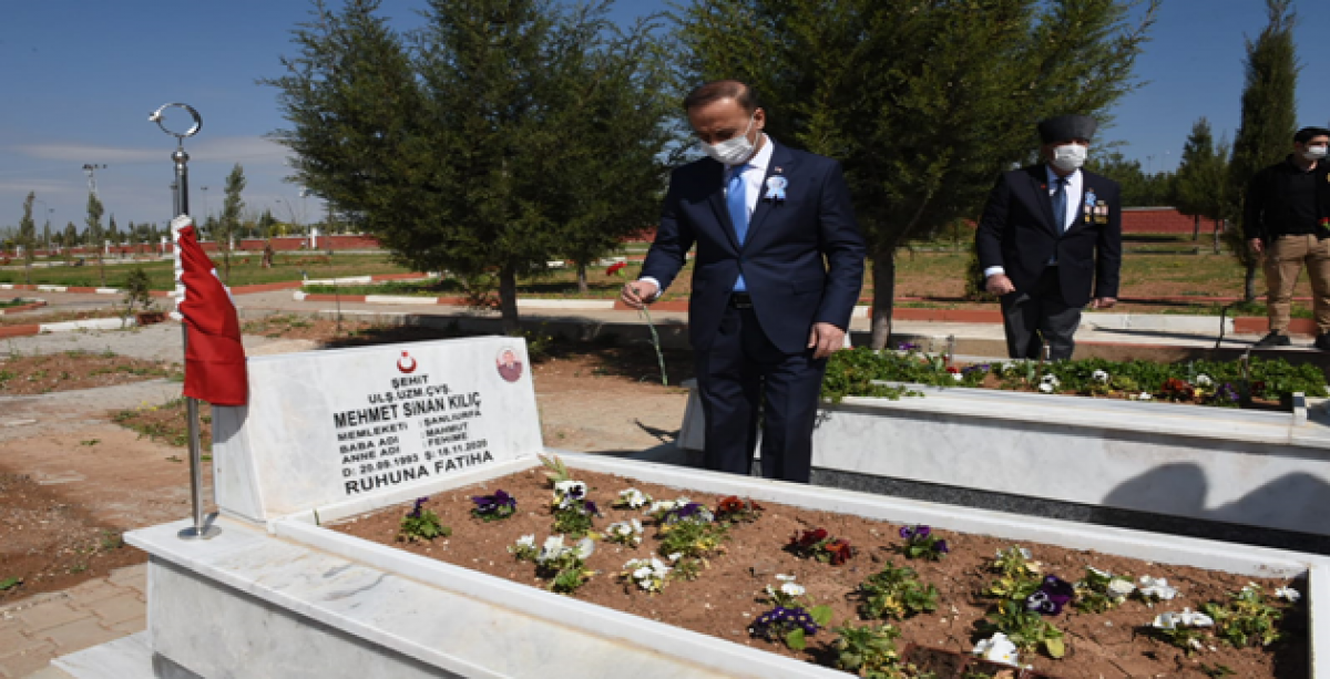 Yeni Asri Mezarlıktaki Şanlıurfa Şehitliğinde düzenlenen programda, Şanlıurfa Valisi Abdullah Erin, Garnizon Komutanı Tuğgeneral Oktay Ağbuga, Büyükşehir Belediye Başkanı Zeynel Abidin Beyazgül ve İl Emniyet Müdürü Selçuk Doğuş tarafından şehitlik anıtına çelenkler sunuldu.