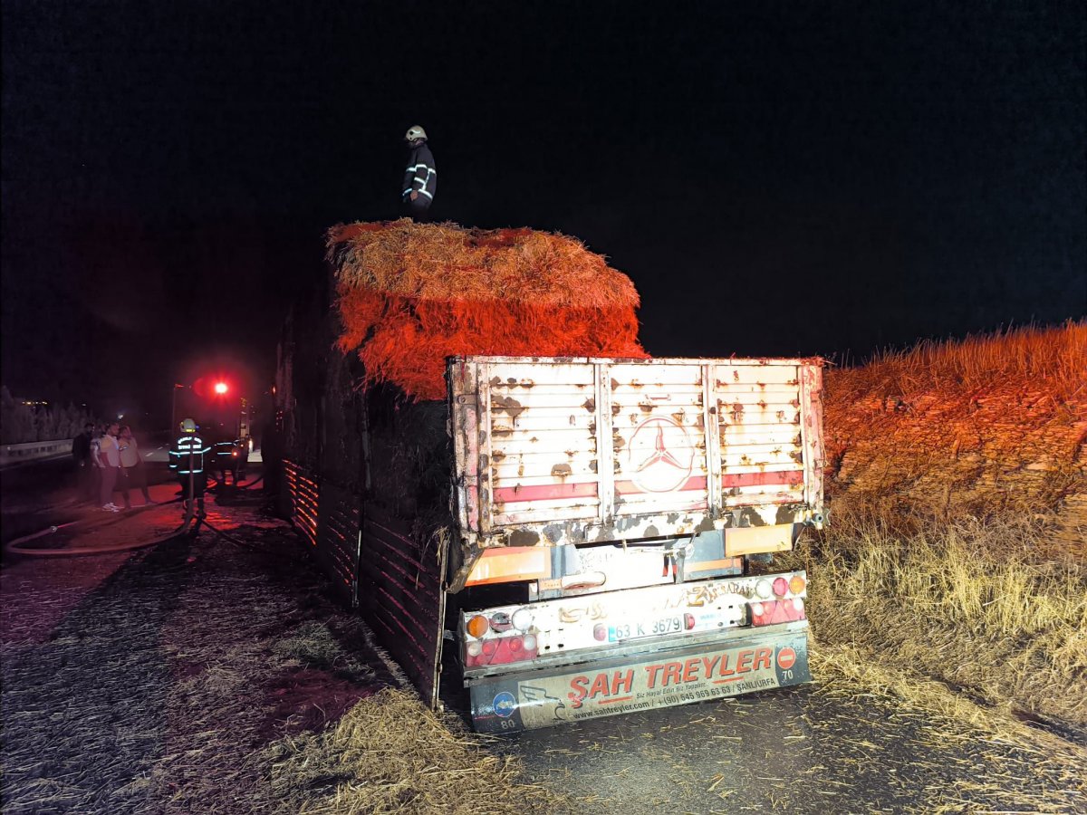 Şanlıurfa'da seyir halindeki saman yüklü TIR, bilinmeyen bir nedenle alev aldı. İtfaiyenin hızlı müdahalesine rağmen tonlarca saman ve TIR’ın dorsesi tamamen yandı.