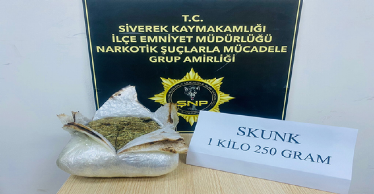 Şanlıurfa’nın Siverek ilçesinde polis tarafından düzenlenen uyuşturucu operasyonunda 2 şüpheli gözaltına alınırken 1 kilo 250 gram skunk ele geçirildi.