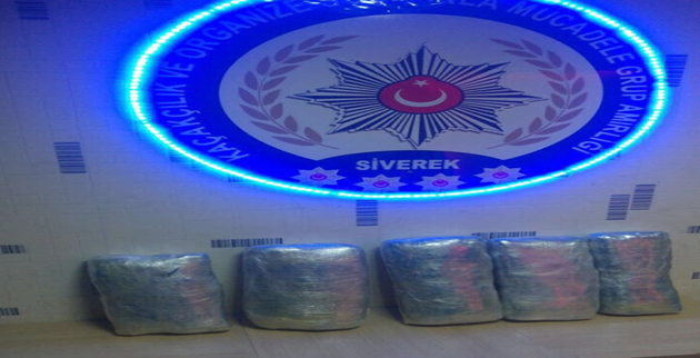 Edilen bilgilere göre, Şanlıurfa Emniyet Müdürlüğüne bağlı Kaçakçılık ve Organize suçlarla Mücadele Şubesine bağlı Narkotik Büro Amirliği ekipler yol kontrolü takip ettikleri K.A. ideresindeki 34 .. 7679 plakalı aracı Siverek'te durdurdu. Araç da yapılan aramada valizlerin tabanında gizlenmiş 5 parça halinde toplam 12 kilo 320 gram esrar maddesi ele geçirildi. Olayla ilgili adli tahkikat devam ettiği belirtildi.