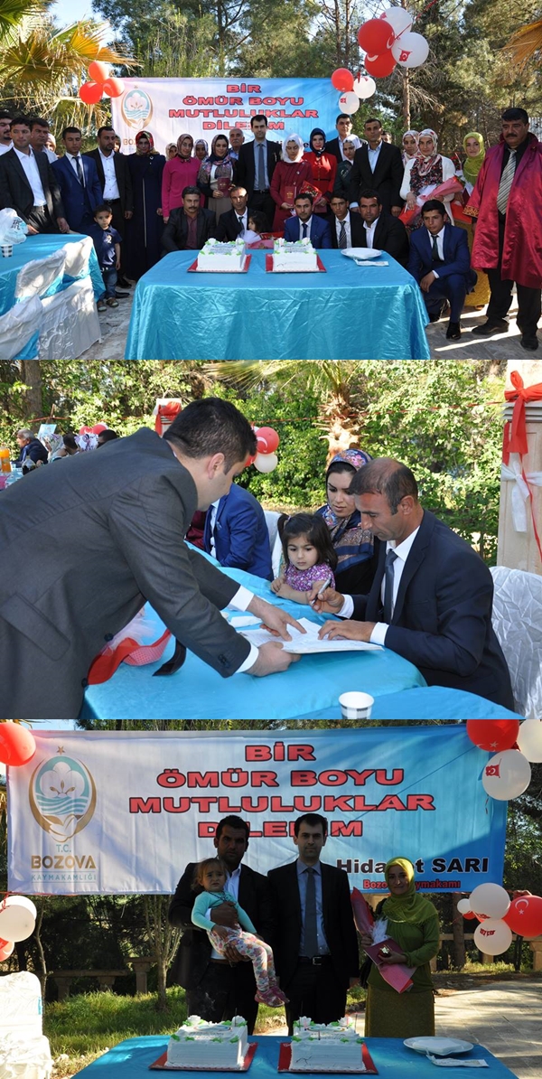 Çatak tesislerinde gerçekleştirilen toplu nikah töreninde Kaymakam Hidayet SARI, İlçe Jandarma Komutanı Ali Abbas EYYÜBOĞLU, Bozova Devlet Hastanesi Başhekimi M. Fatih AKSOY, İlçe Milli Eğitim Müdürü İzzet KILIÇ, İlçe Müftüsü Abdulcelil ALPKIRAY, İlçe Vakıf Müdürü Veysel CAN, İlçe Gençlik ve Spor Müdürü Nesih ÇİFTÇİ, Tarım Müdürü Sait SARAÇOĞLU, SGK Şube Müdürü Emine BOZAT, Ziraat Odası Başkanı Suphi AKSOY, Şoförler Odası Başkanı Nihat SATICI, Halk Eğitim Müdürü Mehmet ÇETİNER, Ak Parti İlçe Başkanı Mehmet AKGÜN, ÇATOM Sorumlusu Dilek KARA, İlçe Milli Eğitim Şube Müdürleri, Muhtar Mustafa TAŞÇI ve diğer misafirler hazır bulundu. Kaymakamımız yaptığı açılış konuşmasında; “Sağlıklı bir nesil oluşturmanın temelinin sağlıklı bir aile yapısı kurmak olduğuna inanarak ilçemiz sınırları içinde yaşayan ve çeşitli sebeplerle resmi nikahını yaptıramamış çiftlerimizin nikahlarını kıyarak evliliklerini resmileştirmek ve devlet güvencesine almak üzere buradayız. Türk Medeni Kanununun ve çağdaş yaşamın bir gereği olan resmi nikah toplumun en küçük yapı taşı olan ailenin de temelidir. Çiftlerimize aileleri ile birlikte sağlıklı ve uzun bir ömür diliyorum.” dedi. Kaymakamımız atılan imzaların kadına duyulan saygının bir ifadesi olduğunu söyleyerek kadının geri plana atılmaması gerektiğini belirtti. Kaymakamımız ve davetli kurum amirlerinin birer çiftin şahitliğini yaptığı nikah töreninde Bozova Belediyesi nikah memuru, 14 çiftin nikah akitlerini gerçekleştirdi. Hayatlarının bu mutlu gününde, yeni bir hayata başlamak için “evet” diyen çiftlere aile cüzdanlarını Kaymakam Sayın SARI takdim etti. Kaymakamlığımız tarafından yaptırılan nikah pastalarını da çiftlerle birlikte kesen Kaymakamımız Hidayet SARI çiftlere ayrıca altın hediye etti. Toplu nikah töreni, Kaymakam Hidayet SARI ve 14 çiftin katılımıyla toplu fotoğraf çekilmesiyle son buldu.