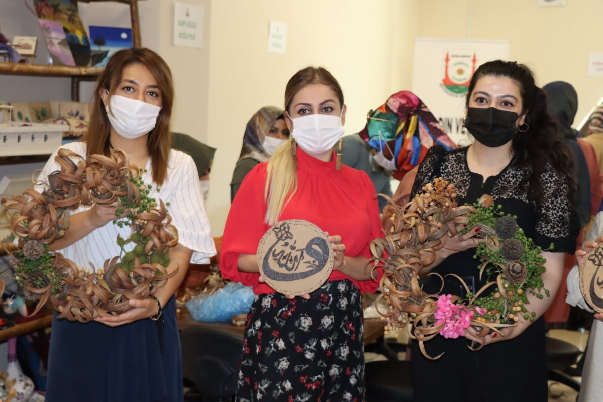 Kurslara katılan kadınlara, emek vererek yaptıkları organik kapı süsü, kokulu sabun ve ahşap yakma tekniğiyle yaptıkları ürünler etkinliğin sonunda hediye ediliyor.