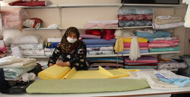 Büyükşehir Belediyesinden Mikro Kredi desteği alarak kendi iş yerini açan Hatice Fidanoğlu, kendi ürettiği çeyiz ve nevresim ürünlerini pazarlama imkânı bularak aile ekonomisine katkıda bulunuyor.
