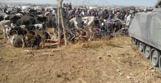 Vali İzzettin Küçük'ün talimatları ile Suruç ilçe Gıda tarım ve Hayvancılık Müdürlüğü tarafından dün gece ve sabah saatlerinde Türkiye-Suriye sınır hattında bekletilen büyükbaş ve küçükbaş hayvanlara yem ve su verildi. Sınırın Mürşitpınar, Yumurtalık ve Göktepe bölgelerinde dört gündür bekletilen hayvanların telef olmaması için harekete geçen Vali Küçük, yetkilileri harekete geçirdi. Kısa sürede temin edilen yemler sınırın diğer tarafında bekletilen hayvanlara iş makinelerinin yardımıyla verildi. Hayvanların su ihtiyaçları ise Büyükşehir Belediyesine ait itfaiye araçlarından takviye edilen sularla giderildi.