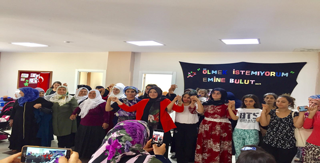 Kursiyer kadınlar yaptıkları çağırılarla kadınlara yönelik artan şiddete bir son verilmesini talep ederek eski eşi tarafından çocuğunun gözleri önünde vahşice öldürülen Emine Bulut’un son sözlerini” Ölmek istemiyorum” bir bez pankarta yazarak tepkilerini dile getirdiler.