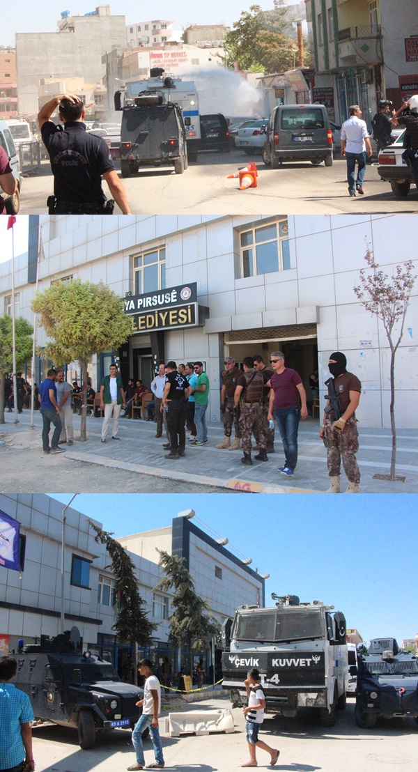Bugün İçişleri Bakanlığı'nca kayyum ataması yapılan 28 belediye arasında bulunan Suruç Belediyesi'ne, sabah erken saatlerde polisler geldi. Polislerin, belediye çevresinde önlem almasının ardından çağırılan Halil Akbaş'a, bakanlığın kararı tebliğ edildi. Suruç Beledeyesi'ne kayyum olarak atanan Şanlıurfa Vali Yardımcısı Tarık Açıkgöz göreve başladı. Belediyeye kayyum atandığı haberinin ardından yaklaşık 200 kişilik grup, Suruç Belediyesi önünde toplanarak protesto gösterisi yaptı. Bölgede önlem alan polisler de kalabalığı dağılması konusunda megafon anonsu ile uyardı. Verilen sürenin ardından dağılmayan ve yapılan yeni çağrılara da olumsuz yanıt veren kalabalığa polisler, zırhlı araçlardan biber gazı ve basınçlı suyla müdahale etti. Müdahalenin ardından kalabalık bölgeden ayrılırken, polislerin belediye çevresi ile ilçe genelindeki önlemi devam ediyor.
