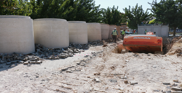 Şanlıurfa Büyükşehir Belediyesi ŞUSKİ Genel Müdürlüğü, Karaköprü ilçesinde yağmur suyu drenaj hat döşeme çalışmalarını sürdürüyor.
