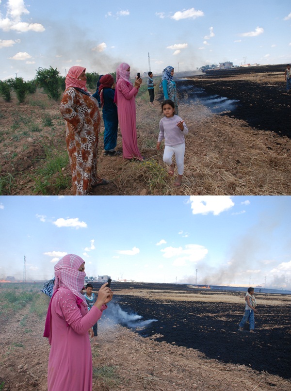 Şanlıurfa'nın Akçakale ilçesi Çadır kent yakınında yangını izleyenlerin ortaya koydukları tablo, yanan anızdan daha çok ilgi çekti. Vatandaş emeği olan buğday tarlası yanarken, bazı Suriyeli bayanlar geçmişler yangının karşısına, yangını cep telefonuna kaydedip izledi.
