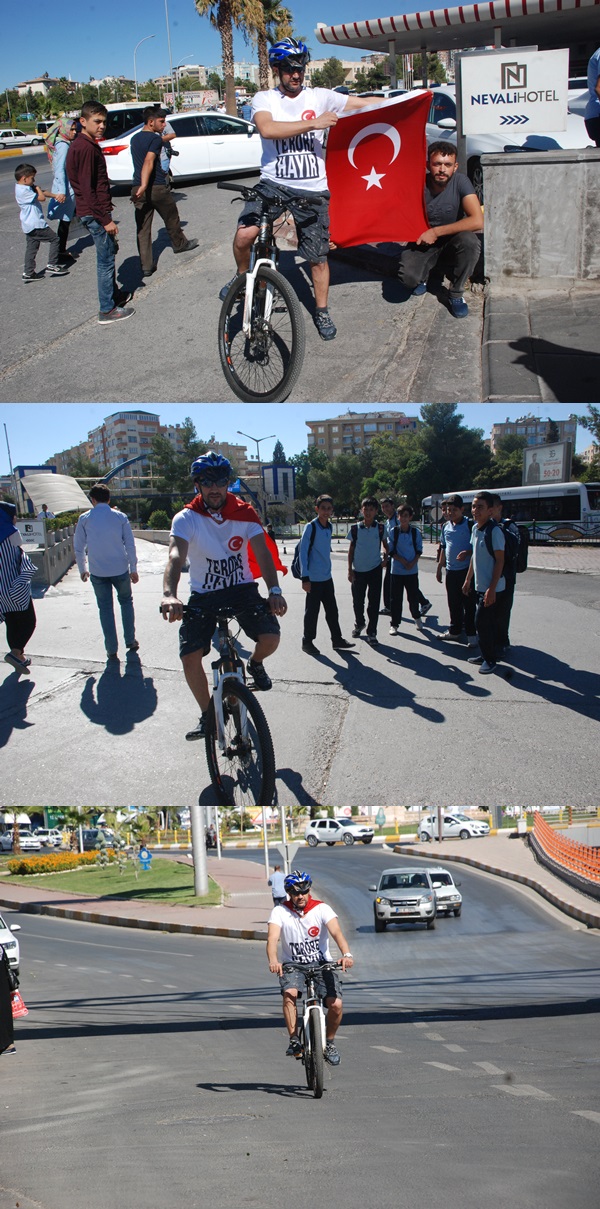 Terör hayır için pedal çevirecek olan Emlakçı Mehmet Yaşarsoy, "Son günlerde tırmanan terör olayların protesto etmek için Şanlıurfa halkının teröre karşı olduğunu anlatmak için Ankara'ya bisikletimle yola çıkıyorum her gün 100 kilometre yol ile 11 günde Ankara'ya ulaşmayı amaçlıyorum Cumhurbaşkanlığı Külliyesinde sayın Cumhurbaşkanımız Recep Tayyip Erdoğan'a Şanlıurfa'dan getirdiğim Şanlı bayrağımızı Şanlıurfalılar adına  taktim edeceğim" dedi.