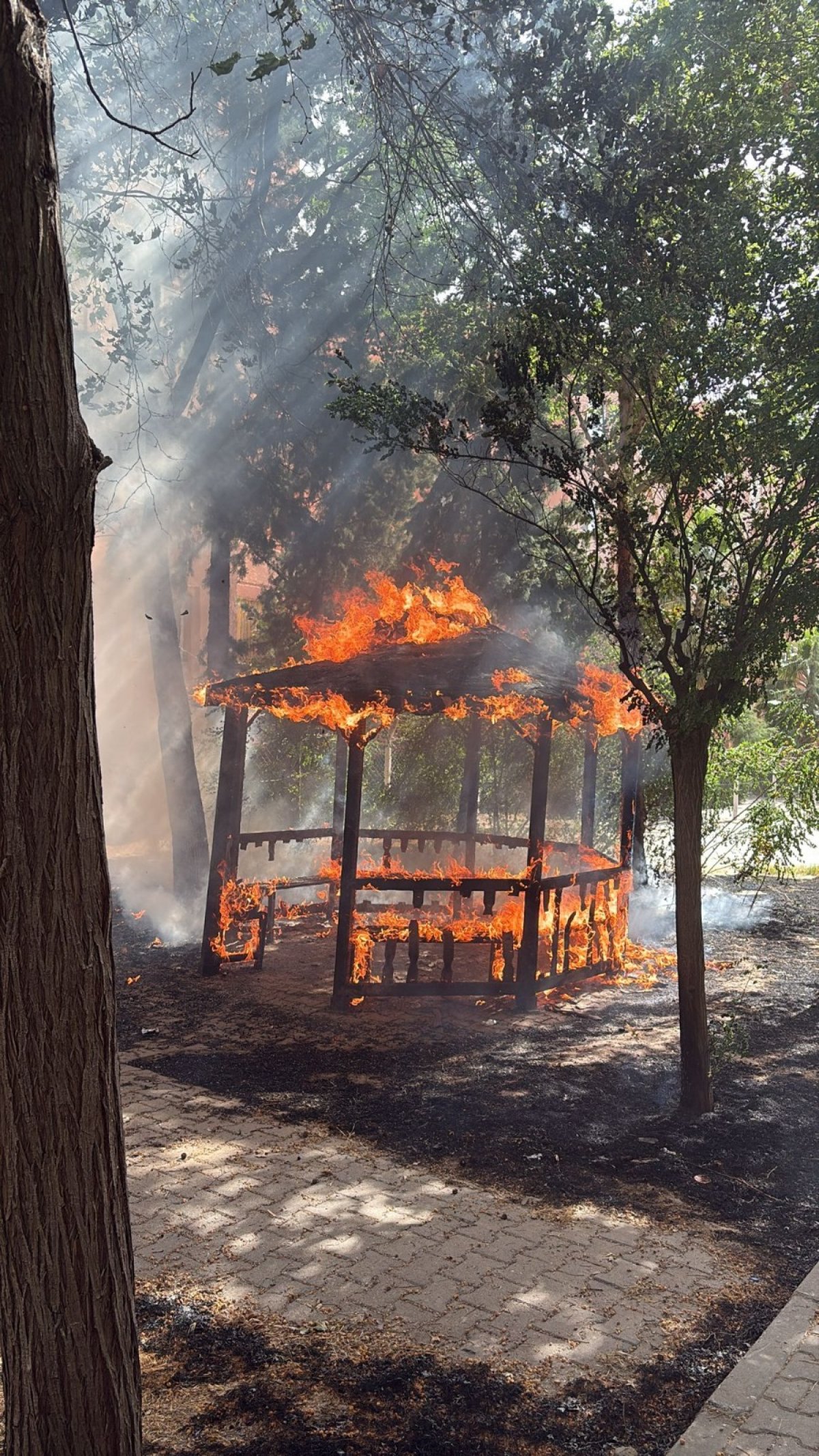 Şanlıurfa’nın Birecik ilçesinde bulunan TOKİ konutlarında, oturma alanında yer alan bir bankta henüz bilinmeyen bir nedenle yangın çıktı.