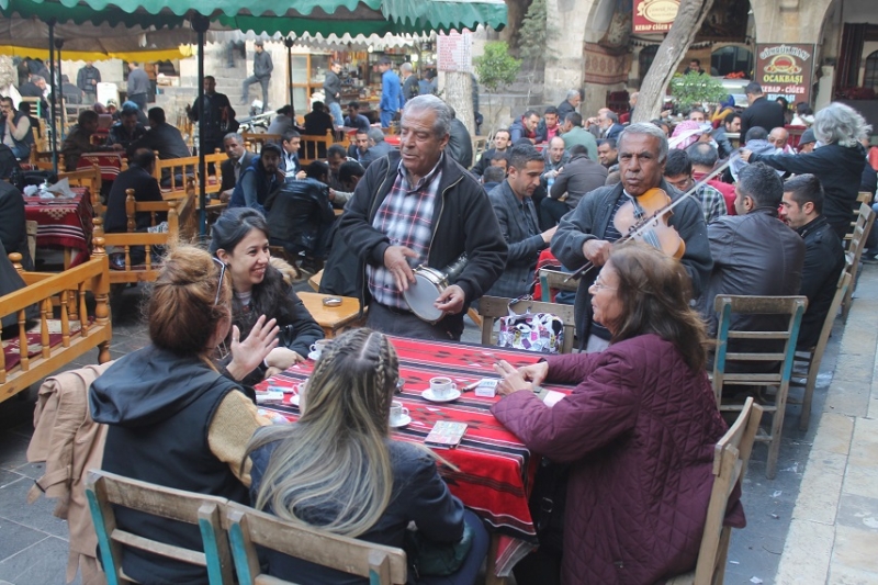 Ellerinde keman ve darbuka bulunan kişiler turistlerin oturduğu masalara gelip Şanlıurfa yöresi türkülerini söyleyerek turistlere güzel anlar yaşatıyor.
