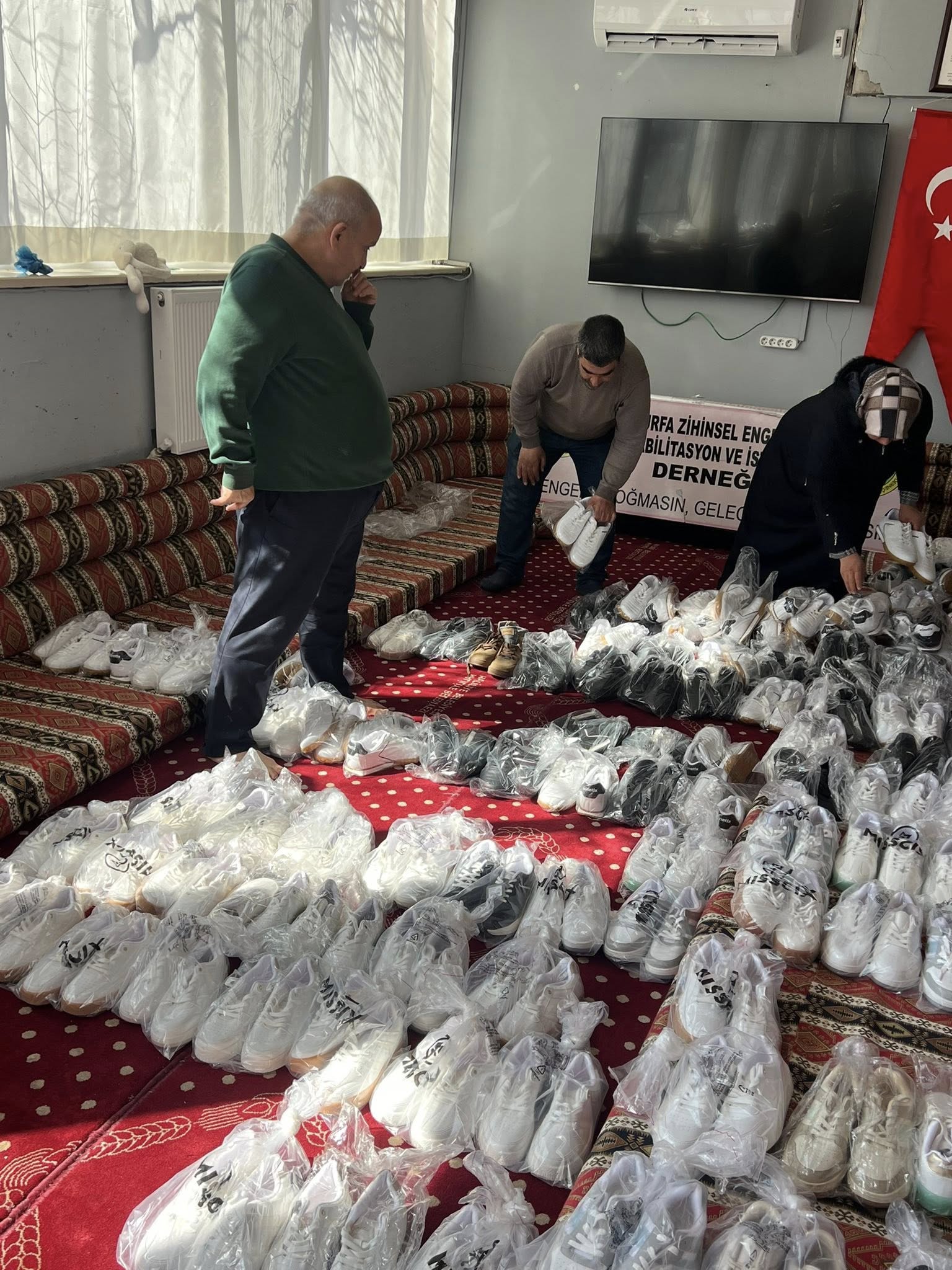 Şanlıurfa Zihinsel Engelliler Rehabilitasyon Ve İstihdam Derneği bulunan engellere Ramazan bayramına kısa bir süre kala bir iş adamı engellilerin ayakkabı dağıtımı yapıldı.