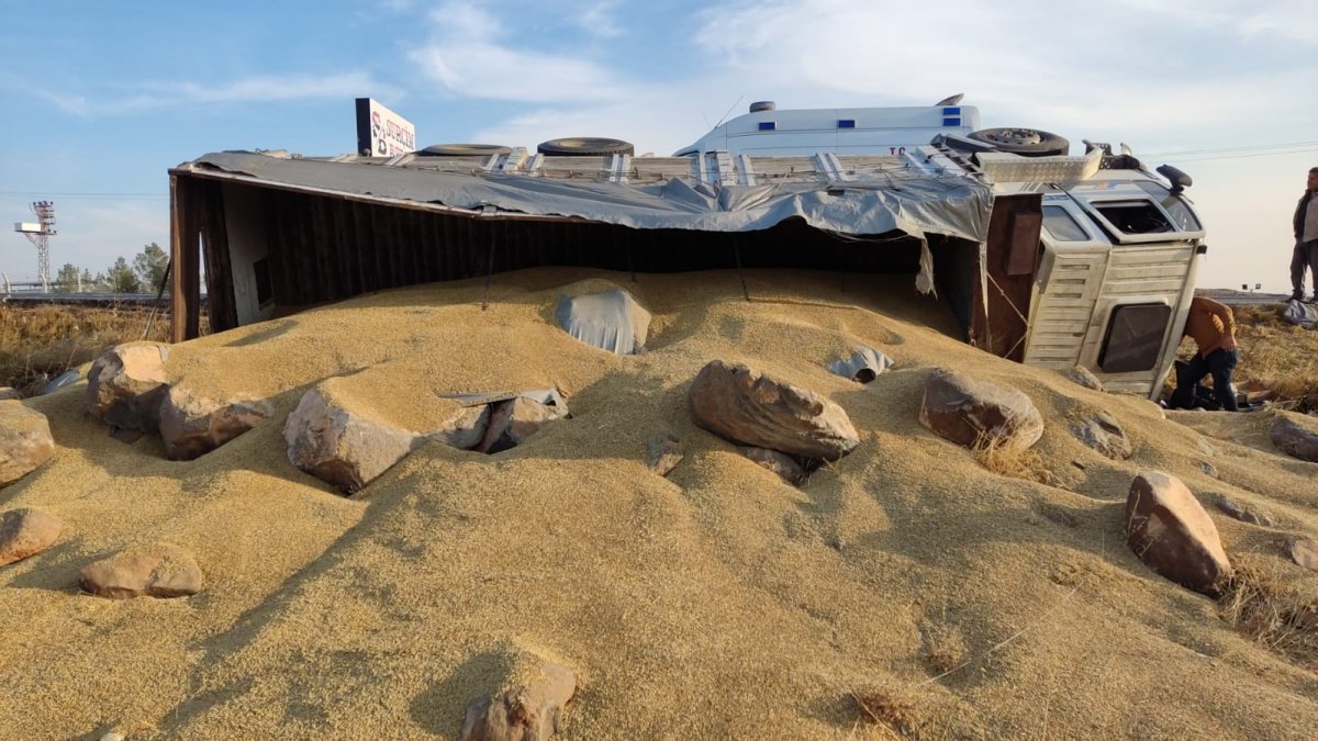 Şanlıurfa’da arpa yüklü kamyonun yola devrilmesi sonucu sürücüsü yaralandı.