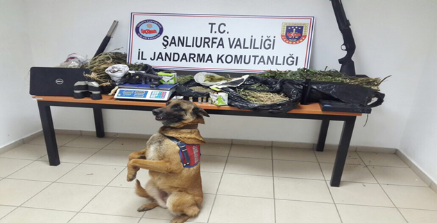 Şanlıurfa’nın Karaköprü ilçesinde Narkotik köpeğin katıldığı operasyonda bir evde yapılan aramada çok sayıda uyuşturucu ve silah ele geçirildi. Olayla ilgili 1 kişi gözaltına alındı.