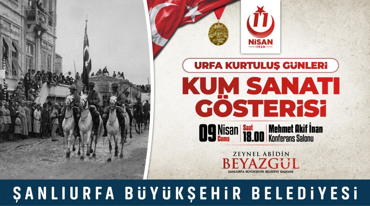 “Urfa Kurtuluş Günleri” etkinlikleri kapsamında 9 Nisan Cuma günü saat 12.00’da Balıklıgöl içerisinde bulunan Dergâh Camii’de Hatm-i Şerif programı düzenlenecek. Saatler 17.00’yi gösterdiğinde ise Mehmet Akif İnan Konferans Salonunda 11 Nisan Kahramanlarının Fotoğraf Sergisi gösterime sunulacak. 18.00’da Kum Sanatı Gösterisi 18.30’da ise Kurtuluş Müzikali etkinliği yer alacak.