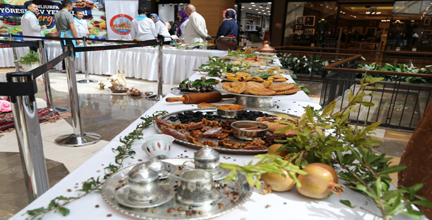 Alışveriş merkezine gelen vatandaşların ilk uğradığı yer haline gelen sergi alanında birbirinden güzel yöresel yemekler beğeniye sunuldu. Sergilenen yemeklerle ilgili bilgilerin de vatandaşlara aktarıldığı etkinlikte vatandaşlar hazırlanan yemeklerin geçtiği aşamaları da yakından görme imkanı buldu.