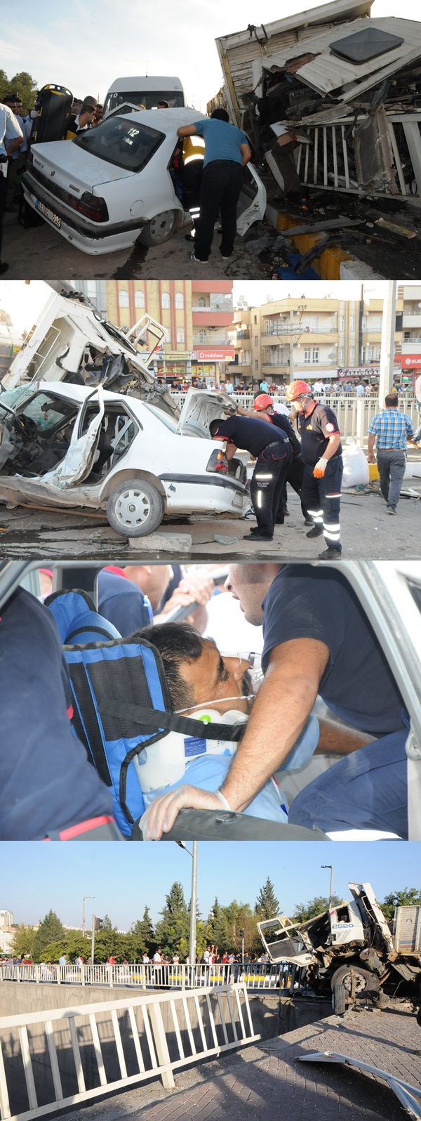 Şanlıurfa'da Akabe rampasından inen yüklü kamyonun freni boşalmasıyla SSK kavşağında 4 aracı altına aldı, bir araç ise köprüden aşağı uçtu.